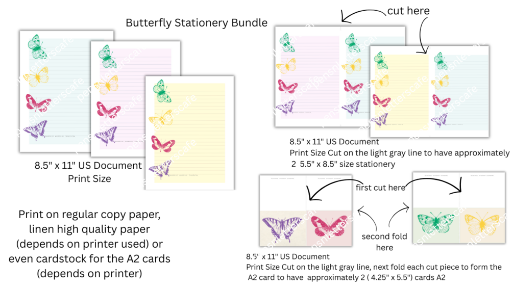 Add a touch of charm to your letters and cards with this beautiful butterfly stationery paper. This bundle includes many options to write a long or short letter, as well as a quick note on an A2 sized card. This is a printable butterfly letter papers, letter writing paper, letter writing set with beautiful butterflies.